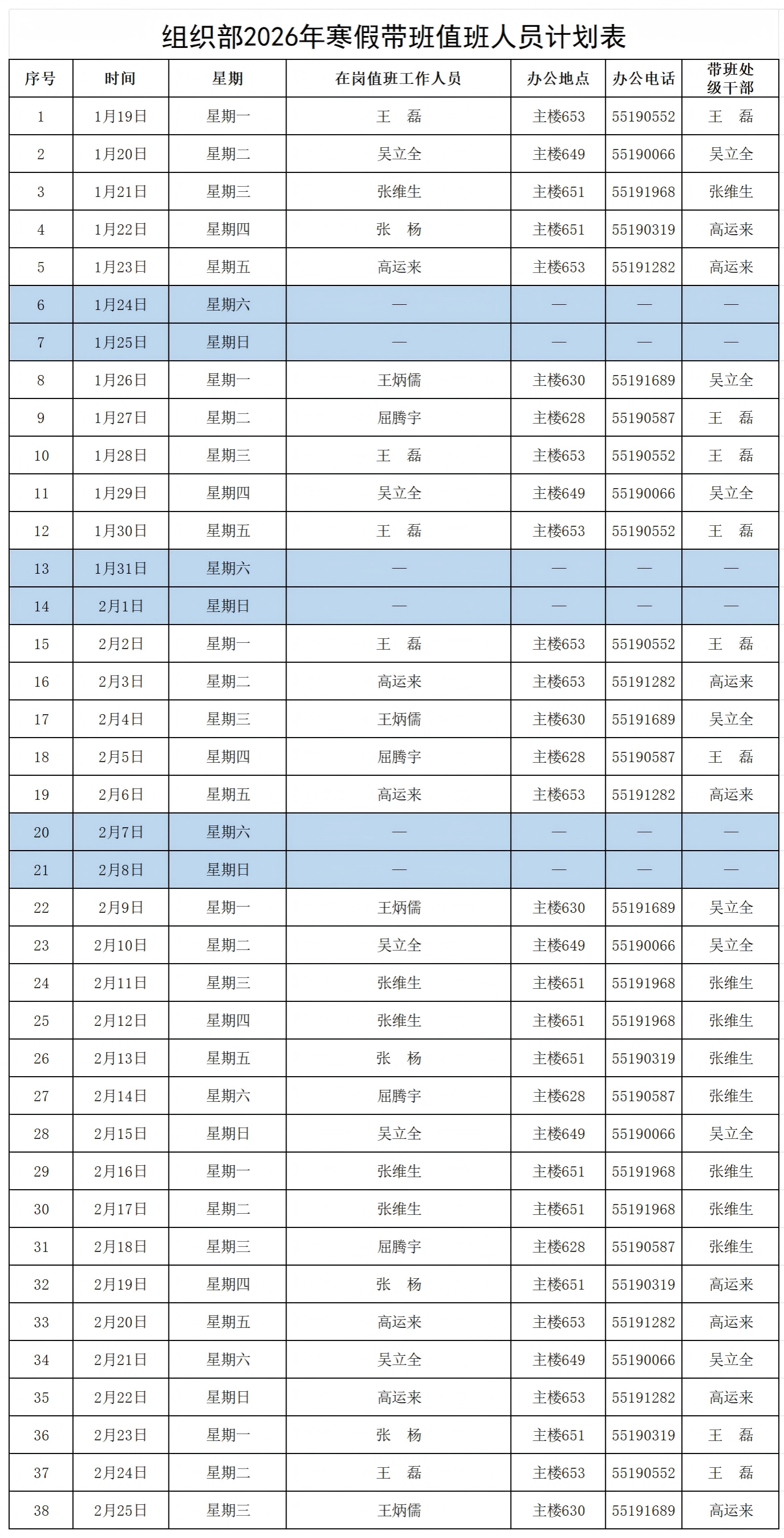 组织部2026年寒假带班值班人员计划表