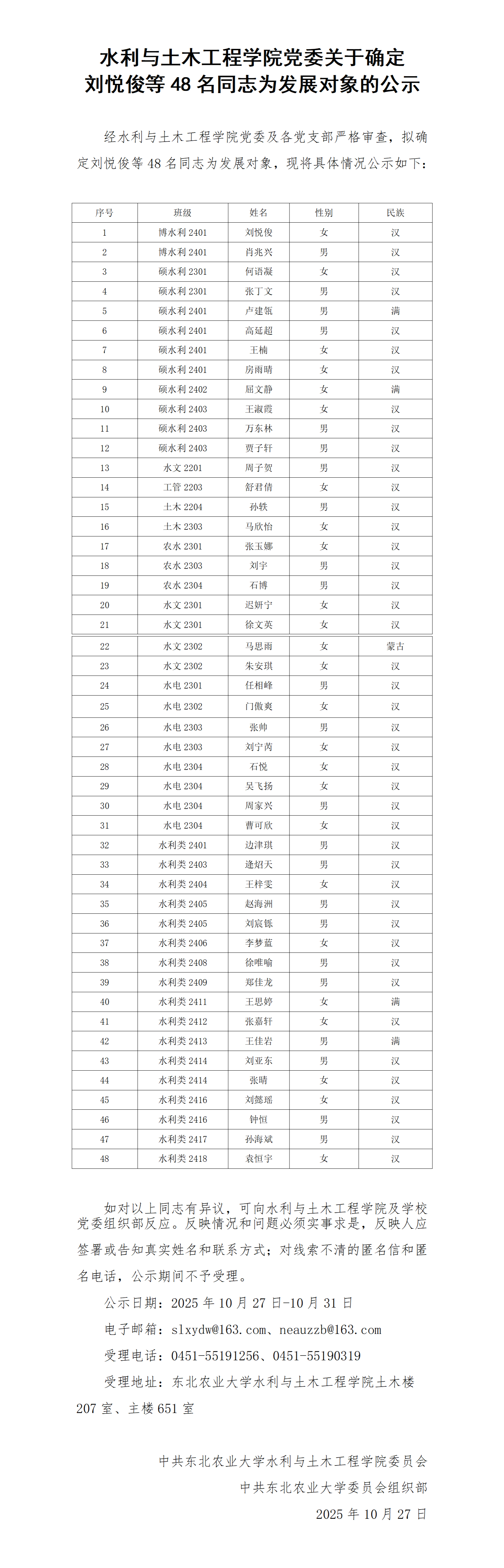 水利与土木工程学院党委关于确定刘悦俊等48名同志为发展对象的公示