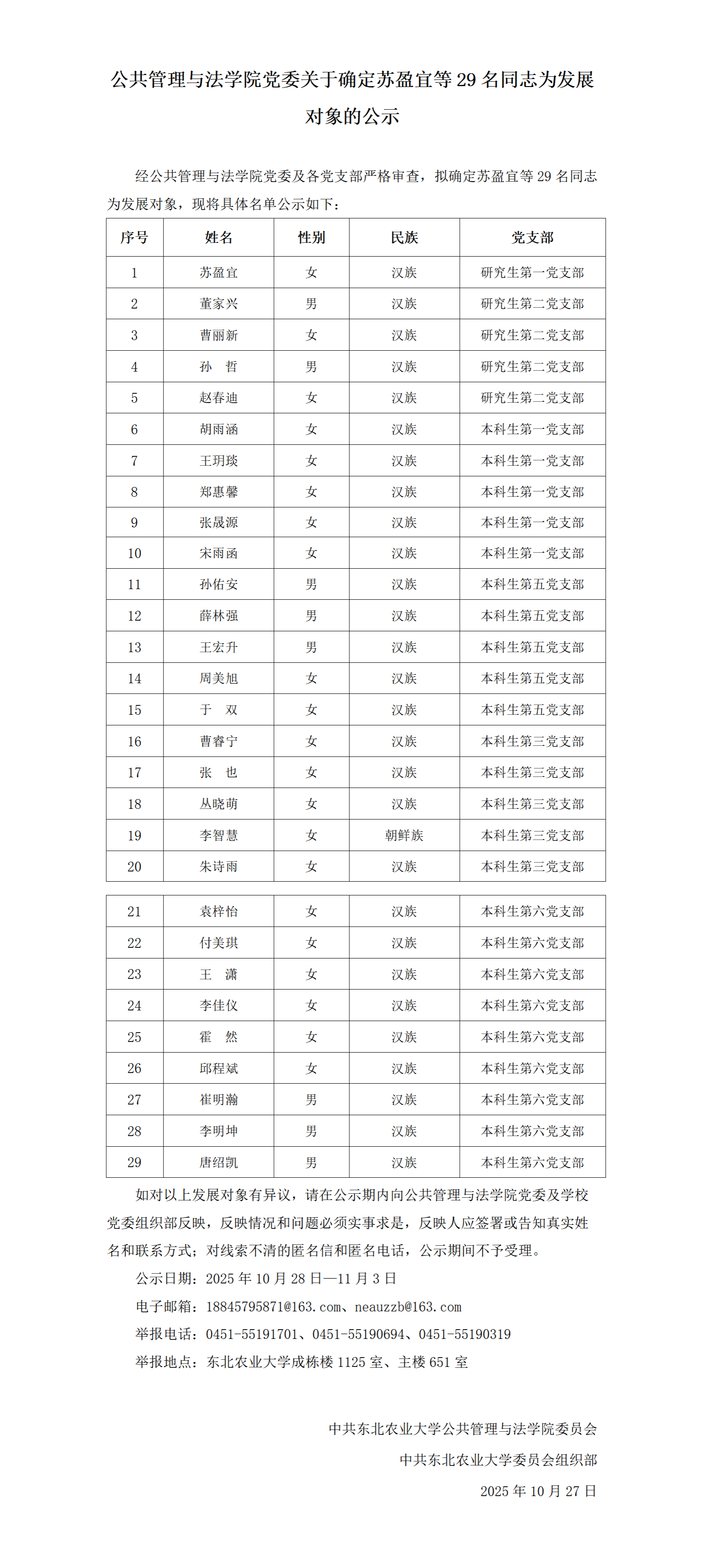 公共管理与法学院党委关于确定苏盈宜等29名同志为发展对象的公示
