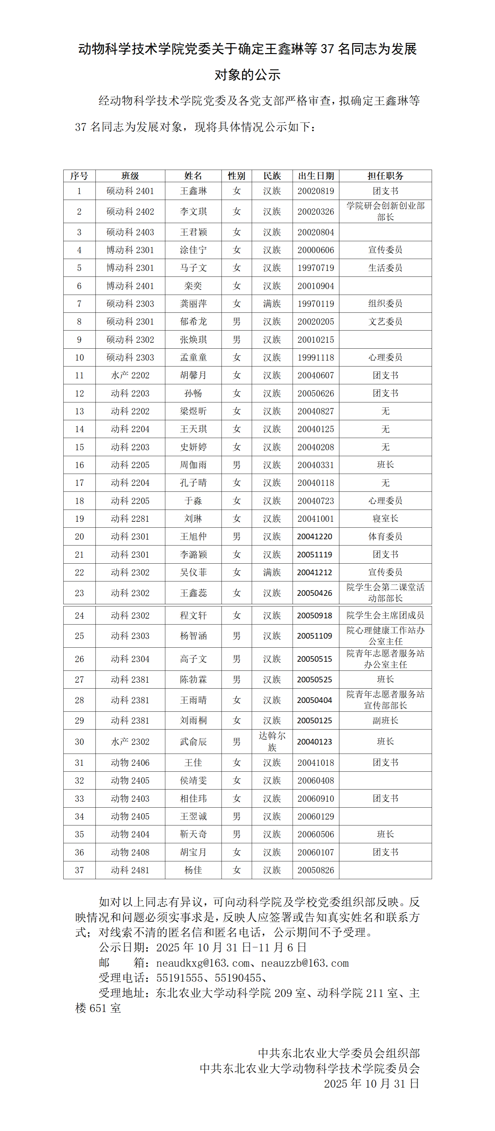 动物科学技术学院党委关于确定王鑫琳等37名同志为发展对象的公示