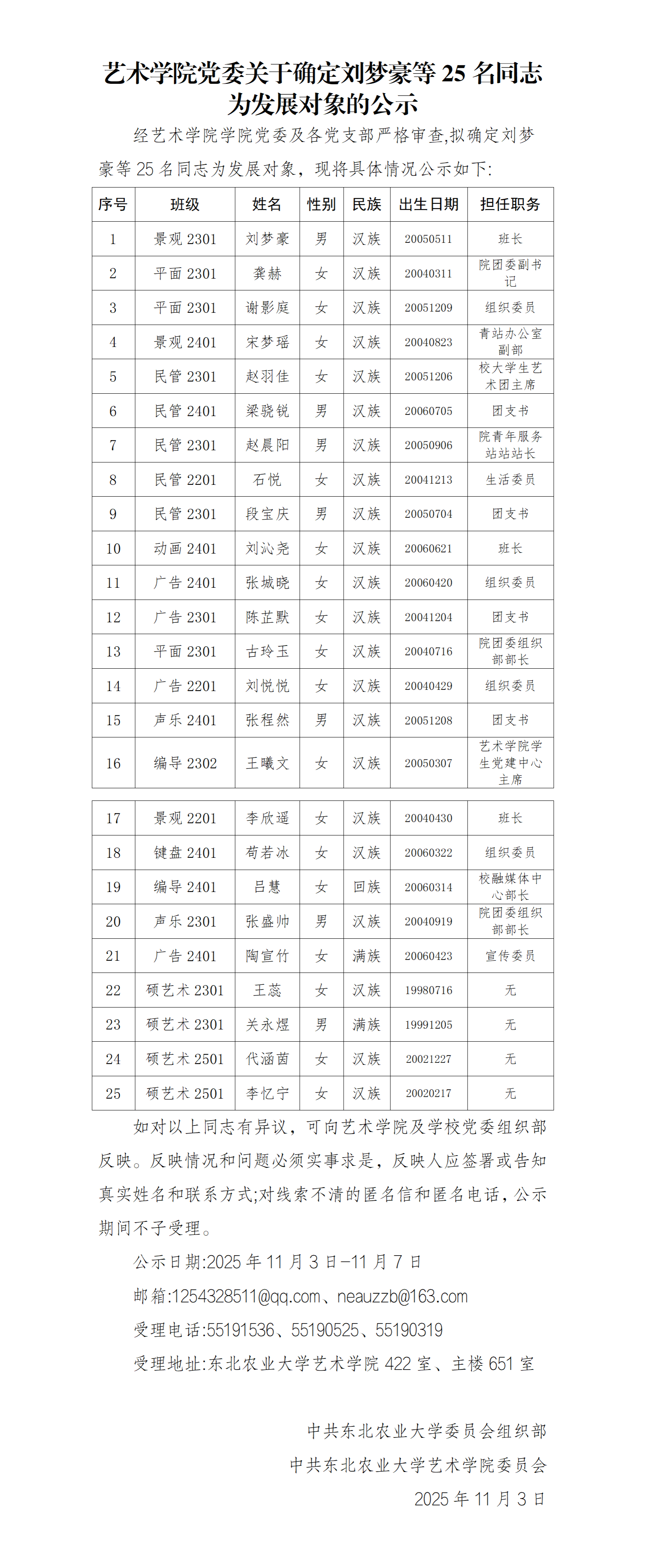 艺术学院党委关于确定刘梦豪等25名同志为发展对象的公示