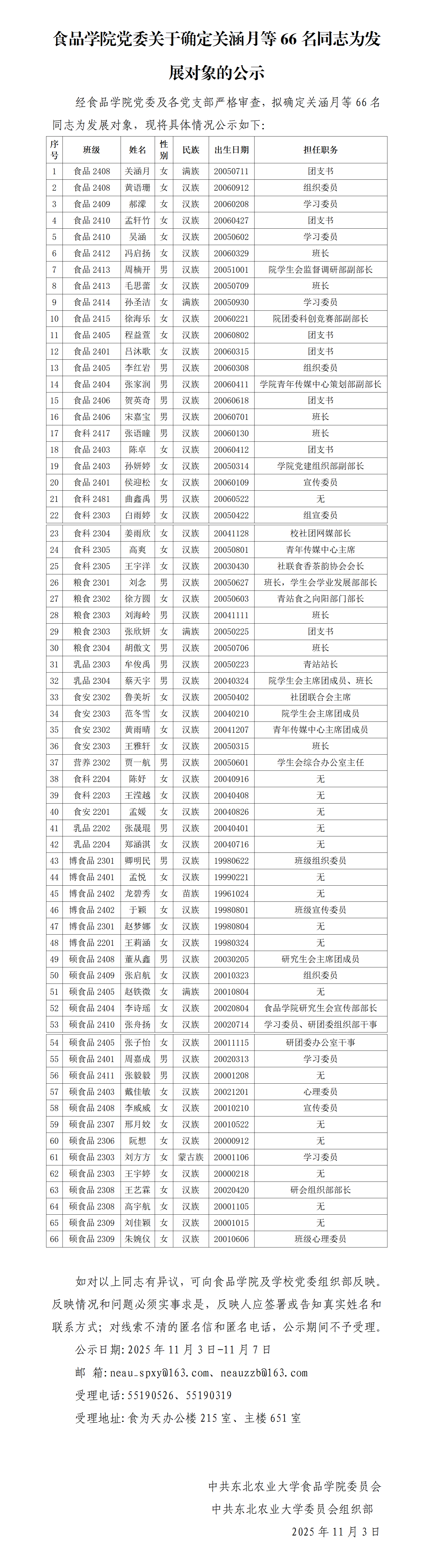 食品学院党委关于确定关涵月等66名同志为发展对象的公示